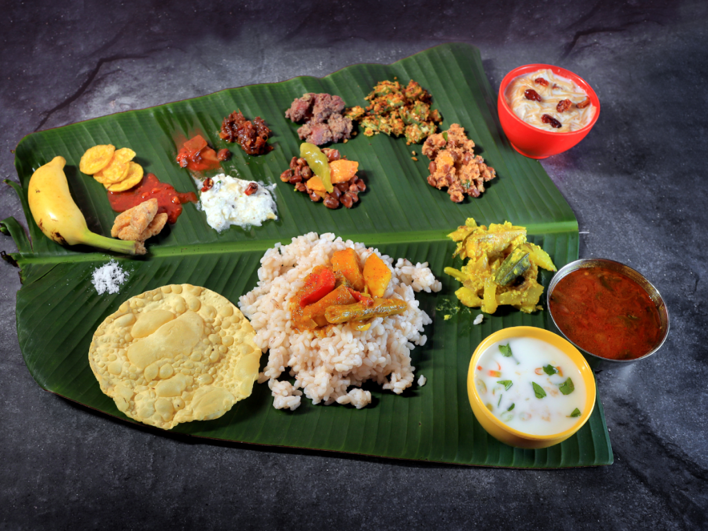 A grand vegetarian spread served on banana leaves, celebrating Kerala’s culinary heritage. Includes: Red Rice / Matta Rice Avial, Thoran, Kootu Curry Olan, Pachadi, Kichadi Pappadam, Pickles, Banana Chips Payasam (Ada Pradhaman / Palada)